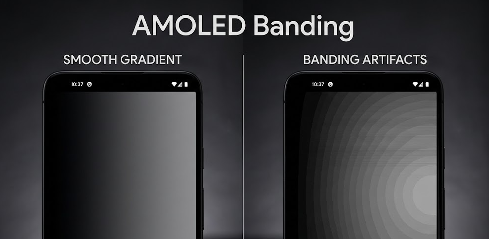 AMOLED 条带是指在低灰色背景或均匀的黑暗场景中最清晰地出现的可见垂直或水平条纹。这是一种 亮度不均匀现象,通常在 1%–20% 灰度级之间观察到。