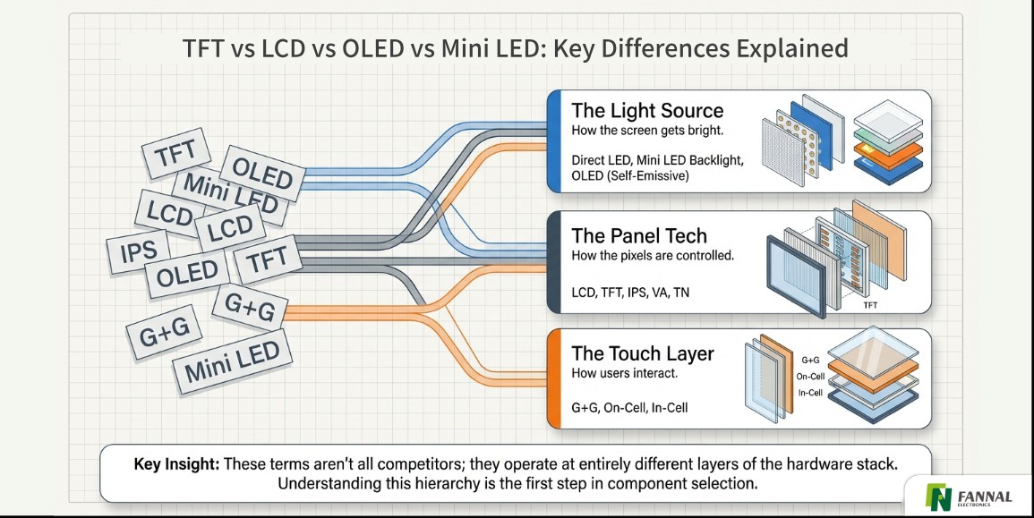 在显示器行业,TFT、LCD、IPS、OLED 和 Mini LED 等术语经常互换使用,但它们实际上属于技术堆栈的不同层。